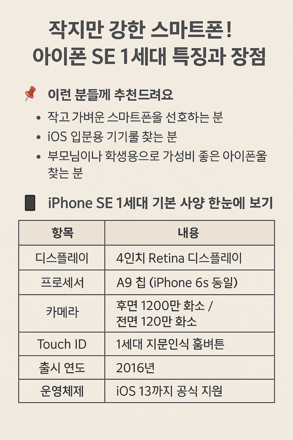 스마트폰 시장에 다양한 제품이 출시되는 가운데, 아이폰 SE1은 아직도 많은 분들에게 관심을 받고 있어요. 컴팩트한 크기와 합리적인 가격으로 사랑받았던 아이폰 SE1, 지금도 구매할 가치가 있을까요? 2025년 기준으로 아이폰 SE1의 특징과 구매 팁을 알아봐요.